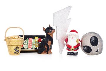 The collection of novelty clutches are inspired by the Kardashian-Jenner family’s love for the holidays, explains the luxury brand, and includes Santa, an alien head, a sushi tray, a lightning bolt, a pot of gold, and a Doberman puppy.
