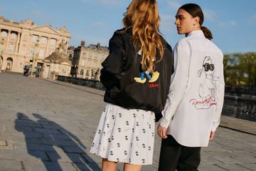 The sketch appears in various forms and sizes across the capsule, repeating as an all-over print on various styles, peeking over the pocket of T-shirts and standing large and central on jumpers. The collection also features the quintessential white shirt, a branded bomber jacket and a trench coat, as well as a backpack and handbag.