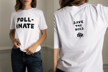 The limited-edition white unisex T-shirt designed by Bella Freud features a witty homage to the bees, with ‘Poll-inate’ on the front and ‘Save the Bees’ on the back. Made in Dorset, the T-shirt is made in 100 percent soft organic cotton and all proceeds will be donated to bee conservation and nature-friendly farming initiatives.