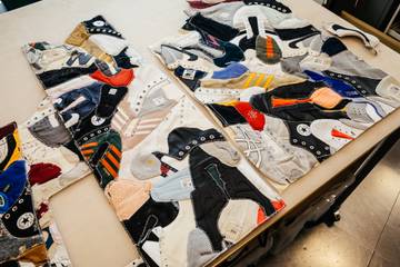 London-based Are You Mad is a waste design studio, agency and consultancy that specialises in transforming discarded materials into objects, furniture and shop fits. For the project with Schuh, the design studio’s in-house team of ‘Certified Wastemen’ meticulously dissected and deconstructed over 600 pre-loved shoes by hand in their East London studio, preparing the materials for their next life.