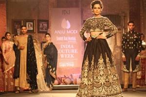 Bollywood star Kangana Ranaut walked the ramp for Anju Modi on the second day of India Couture Week. The actress looked stunning in a heavily embroidered black lehanga-choli, as she strutted for Modi’s bridal collection titled ‘Manikarnika’. Modi’s line depicted a woman of the past, reborn in the present. Manikarnika is a journey, back in time and now. The color palette was earthy, sepia tones like sand, old rose reminiscent of the centuries past. The rich jewel tones of burgundy, ruby, emerald, added the plushness of luxury. The embroideries were derived from the architecture, with the paintings of the Ajanta-Ellora caves as perfect muses to the artwork and details.