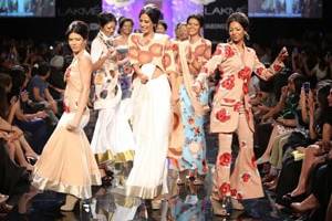 Her other ensembles were a blend of flared minis in beige, slinky gowns with multi prints, long sleeved, thigh length jacket with flared pants and cut-out sari gown, took the audience back to the era of 60’s. Trapeze printed top with bell sleeves, attached dupattas for skirts, bell bottom style shararas, long sleeved tail-coat cholis with printed saris and drop waist maxi were other additions showcased through the show.